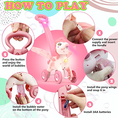 • 【Value For Money】Bubble machine gift box contains a cute pony,2 bubble solution,2 bubble concentrate solution,a use manual,a screwdriver,four bubble wands,9 bubbler sets. Tips: requires 4 *AA batteries (not included)