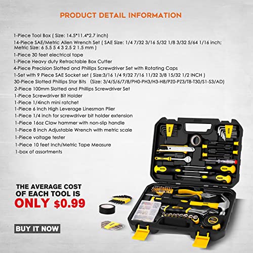 - 14-Piece SAE/Metric Allen Wrench Set. 1-Piece 30 feet electrical tape. 1-Piece Retractable Box Cutter. 4-Piece Precision Slotted and Phillips Screwdriver Set. 1-Piece voltage tester. 1-Piece 1/4inch mini ratchet. 2-Piece 100mm Slotted and Phillips Screwdriver Set. 1-Piece Screwdriver Bit Holder. 30-Piece Slotted Phillips Star Bits. 1-Piece 6 Inch Linesman Pliers. 1-Piece 16oz Claw hammer. 1-Piece 8 inch Adjustable Wrench. 1-Set SAE Socket set. 1-Piece 10 feet Tape Measure. 1-box of assortments