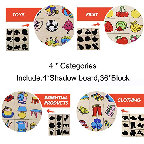 Details: Montessori Shadow Matching Toys,Fruit Recognition Sorter Puzzle fine Motor Educatinal Toy Kids Image Game Toy,great Suitable for Children Over 3 Years Old:2 Ways to Play:1.Take out the shadow board. According to different shapes, find blocks matching shadows. .2. Turn the 36 blocks face down and flip them one by one to quickly classify 4 types of blocks.Material:Made of high quality beech wood.Dimension:6.7 inch*6.7 inch*1.5 inch.Package Include:1* storage box,4*shadow board,36*blocks.